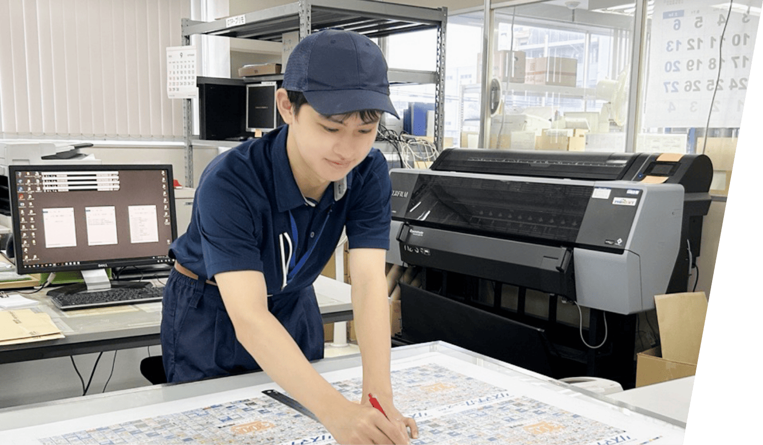 工場での研修後は、店舗に仮配属となりました。受注からデータ処理、印刷・加工、そして梱包の領域を常に学びつつ実践していく日々。周りの先輩方に支えられながら、印刷の知見をより深めていきました。