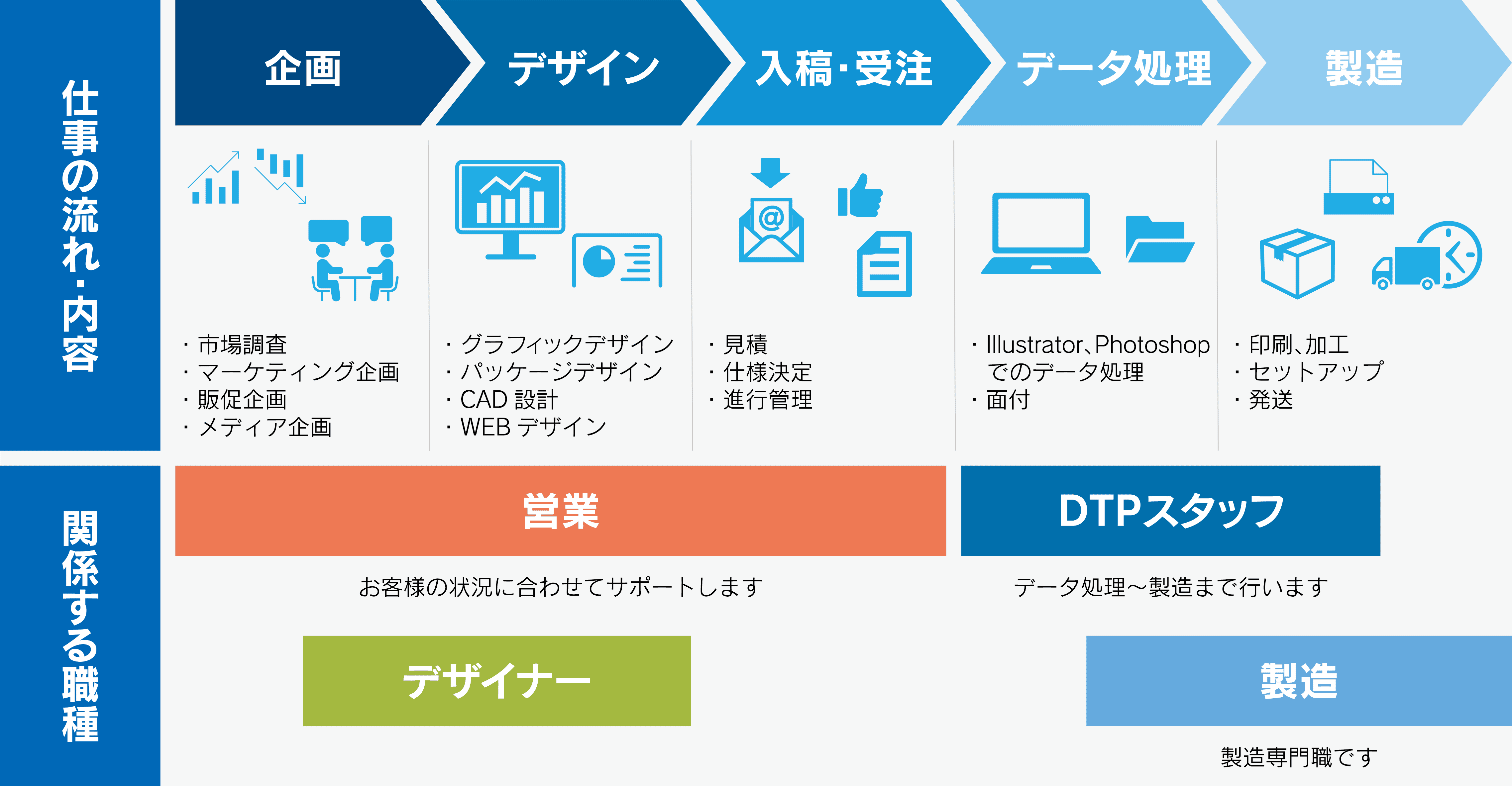 多彩な商材やサービスを活かし、お客さまが「作りたい」と思う制作物の見積、製造手配、納品までをサポートしています。